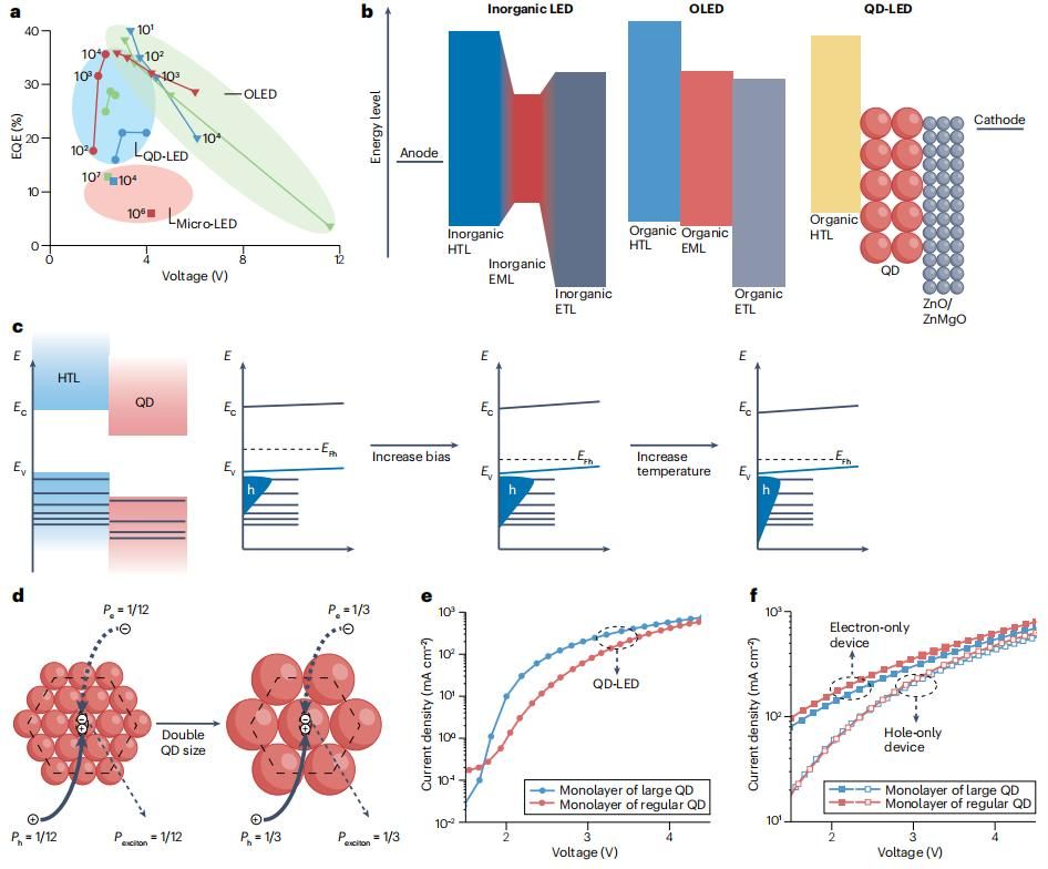 量子点发光二极管器件(QLED)有望成为新一代主流发光显示技术。自1994年以来,研究者们在提高QLED的外量子效率和寿命方面取得了巨大进展,对器件工作和老化机制的理解也越来越深入。然而,仍有一些关键问题有待澄清,例如正老化的起源以及ZnO纳米颗粒在实现器件高性能方面的作用。针对以上问题,研究团队与中国科学技术大学合作,综述了影响QLED的电压、内量子效率和光子输出耦合效率的关键因素。并指出了影响无镉QLEDs和蓝光QLEDs性能的物理机制,也汇集了TCL等公司在产业化进程中所遇到的挑战。研究成果以“Advances in understanding quantum dot light-emitting diodes”为题,发表在Nature Reviews Electrical Engineering期刊上。中科大博士研究生李波、黄色网址大全