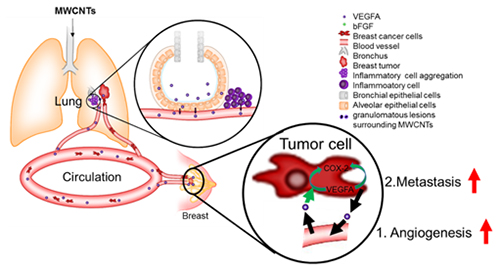 本研究发现,沉积于小鼠肺部的CNT引起的局部微环境改变可显著增强乳腺肿瘤细胞侵入临近血管和周边组织的能力,并促进肿瘤组织内血管生成,从而导致乳腺肿瘤细胞向肺部的转移,形成快速生长的转移灶,甚至进一步在体内形成多器官转移。CNT肺部长期蓄积,刺激肺成纤维细胞和巨噬细胞分泌的VEGFA经血液循环到达乳腺肿瘤,一方面直接促进肿瘤血管生成,另一方面上调肿瘤细胞内源性VEGFA与COX-2的表达,从而启动VEGFA-COX-2的正反馈通路,使乳腺组织内血管生成持续增强,为肿瘤细胞的转移提供更加“丰富的营养”和“肥沃的土壤”。与之相呼应,CNT暴露形成的肺局部炎症和纤维化也为促进肿瘤细胞定向转移到肺及进一步侵袭生长提供了转移前的肺部微环境与转移后的肿瘤微环境。此项研究首次证实了肺部CNT长期暴露对远端部位的乳腺肿瘤转移有明显的促进作用,长期存在的肺部局部炎症可能是乳腺癌发展的主要风险。