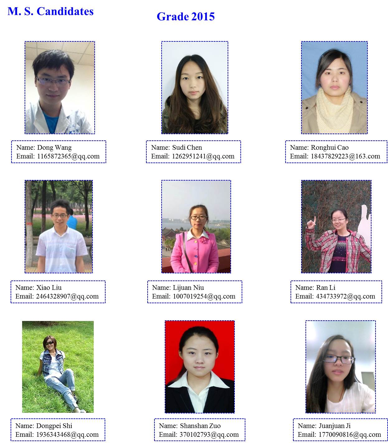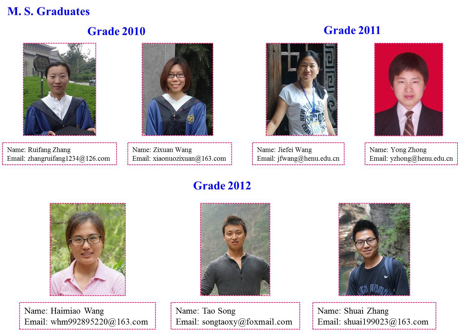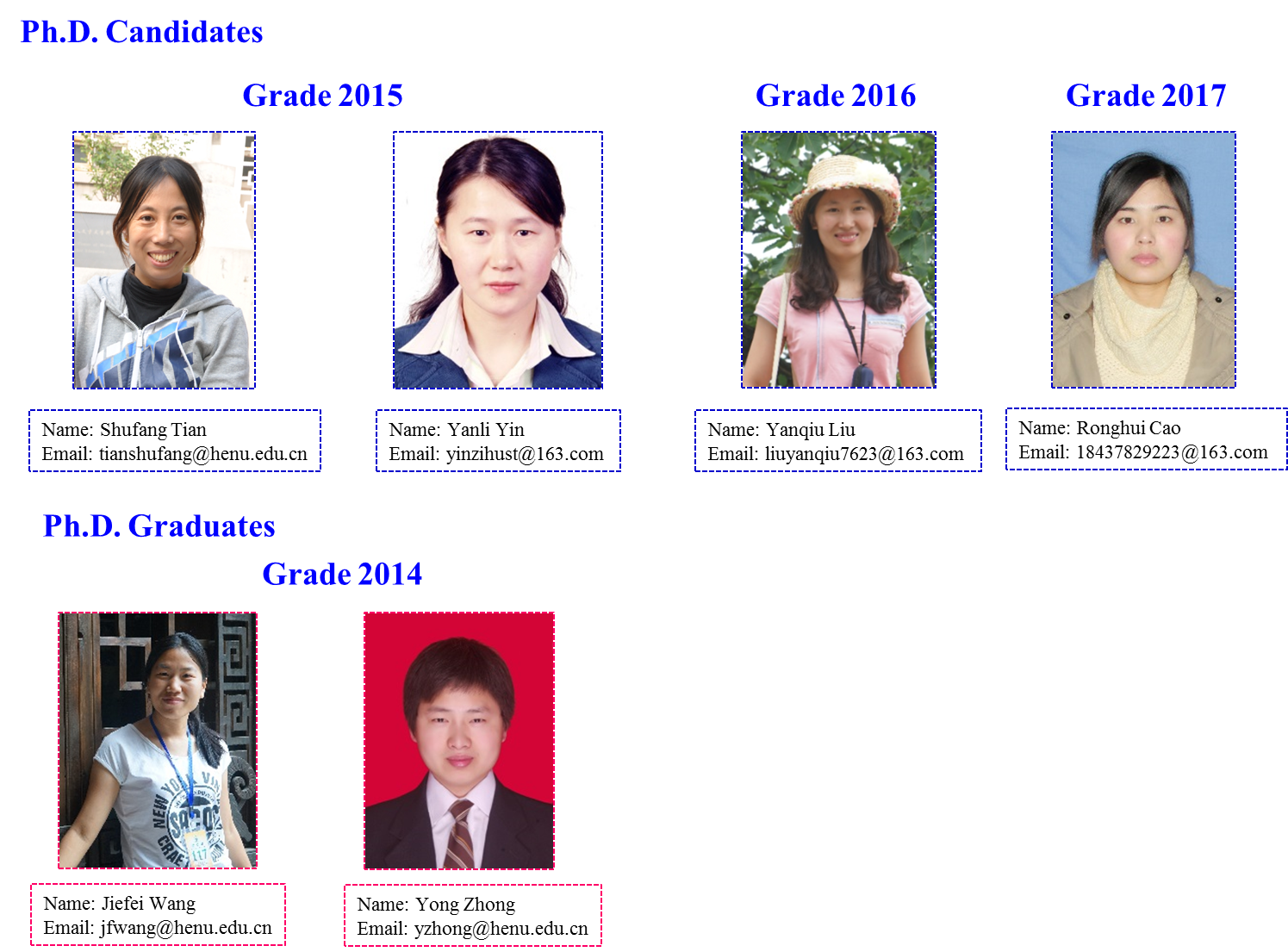 uEducation and Work experience: 1. 9/2007-7/2011, College of Materials and Chemical Engineering, China Three Gorges University, Bachelor of Science 2. 9/2011- 6/2014, Key Laboratory for Special Functional Materials of Ministry of Education, Henan University, Master of Science 3. 9/2014-6/2017, The Key Laboratory of Natural Medicine and Immuno-Engineering, Henan University, Doctor of Science 4. 7/2017-present, Key Laboratory for Special Functional Materials of Ministry of Education, Henan University uResearch Interest: nanostructure-based self-assembly of porphyrin, Z-scheme photocatalyst and atomic layer deposition. uE-mail: ResearcherID N-1586-2014. ORCID ID //orcid.org/0000-0003-1446-3148. uPulications: 1. Jiefei Wang,Yong Zhong, Xiao Wang, Weitao Yang, Feng Bai*, Bingbo Zhang*, Leanne Alarid, Kaifu Bian, and Hongyou Fan*. “pH-Dependent Assembly of Porphyrin-Silica Nanocomposites and Their Application in Targeted Photodynamic Therapy.” Nano letters, 2017, 17 (11): 6916–6921. 2. Jiefei Wang,Yong Zhong, Liang Wang, Na Zhang, Ronghui Cao, Kaifu Bian, Leanne Alarid, Raid E. Haddad, Feng Bai*, Hongyou Fan*. Morphology-Controlled Synthesis and Metalation of Porphyrin Nanoparticles with Enhanced Photocatalytic Performance. Nano Letters, 2016, 16 (10): 6523-6528. 3.Yong Zhong, Jiefei Wang, Ruifang Zhang, Wenbo Wei, Haimiao Wang, Xinpeng Lü, Feng Bai*, Huimeng Wu, Raid Haddad, Hongyou Fan*. Morphology-Controlled Self-Assembly and Synthesis of Photocatalytic Nanocrystals. Nano Letters, 2014, 14 (12): 7175-7179. 4.Yong Zhong, Zixuan Wang, Ruifang Zhang, Feng Bai*, Huimeng Wu, Raid Haddad, Hongyou Fan*. Interfacial self-assembly driven formation of hierarchically structured nanocrystals with photocatalytic activity. ACS Nano, 2014, 8 (1): 827-833. Students in the group